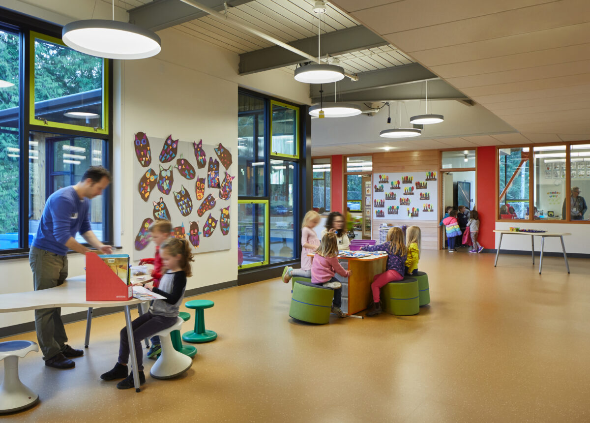 The value of occupant input and data-driven design can be leveraged to impact multiple buildings and refine future design solutions. For example, Blakely Elementary School on Bainbridge Island evolved directly from district feedback on an earlier school design. Staff identified the importance of equal access to shared learning resources, which informed the folded classroom cluster layout at Blakely that gives every classroom a direct line of sight to a shared learning space.