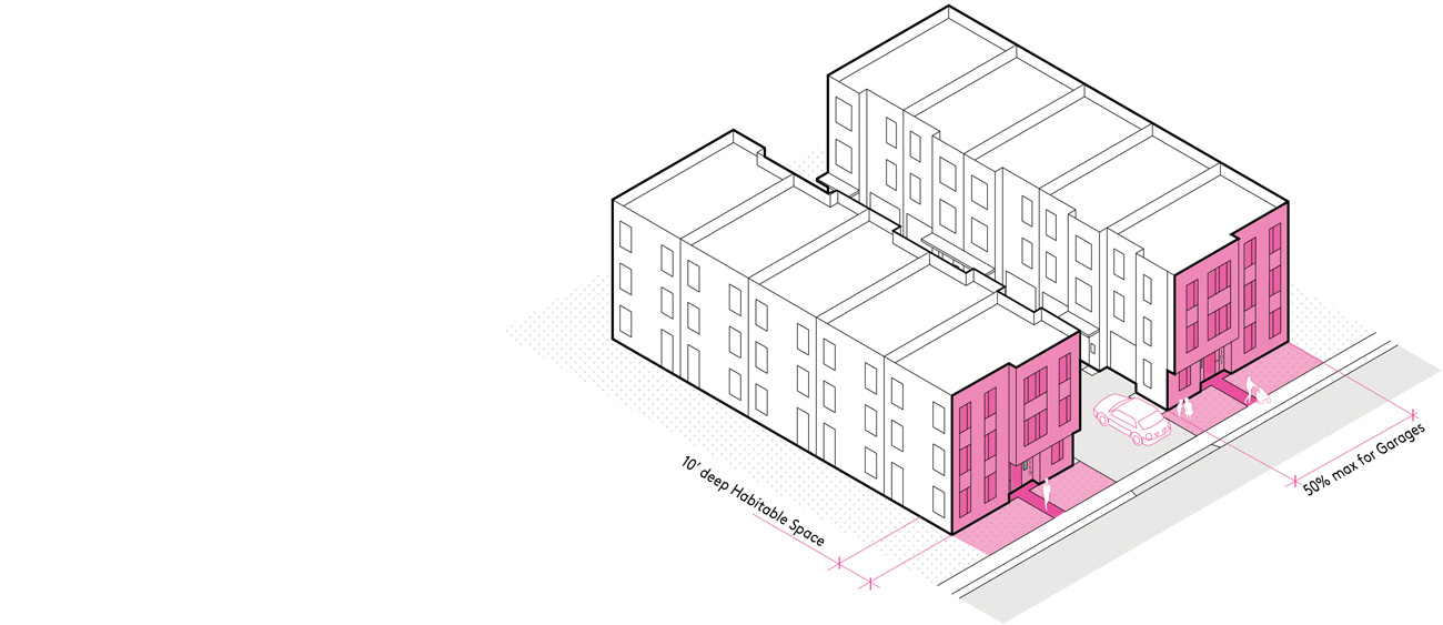 Ground-floor use is equally important. To keep garages and driveways from deadening the pedestrian environment, the standards require a percentage of the ground-floor street frontage to be occupied by Habitable Space at least ten feet deep — living rooms, kitchens, foyers, offices — rather than storage or parking.