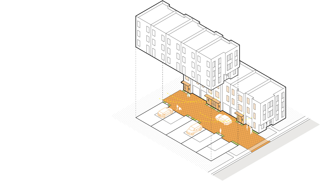 Finally, Improved Parking Courts serve as shared spaces for both vehicles and people. To qualify as true multi-use space, and unlock development bonuses, these courts must include unit entries with address signage, decorative curbless paving, modest landscaping, lighting and transparency on facing façades to support natural surveillance. The intent is to make these spaces function not just for circulation and parking, but for daily activities like neighborly interaction, play and access to homes.