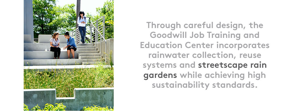 Raingardens that receive water from the roof and the road create a peaceful respite for people in a busy spot in the city. Similarly, the Goodwill Job Training and Education Center showcases how GSI can be implemented within tight urban sites and constrained budgets. Through careful design, the project incorporates rainwater collection, reuse systems and streetscape rain gardens while achieving high sustainability standards. These types of projects are critical because they prove that green infrastructure is not limited to large-scale developments; it can be adapted to a wide range of contexts, making citywide adoption more feasible.