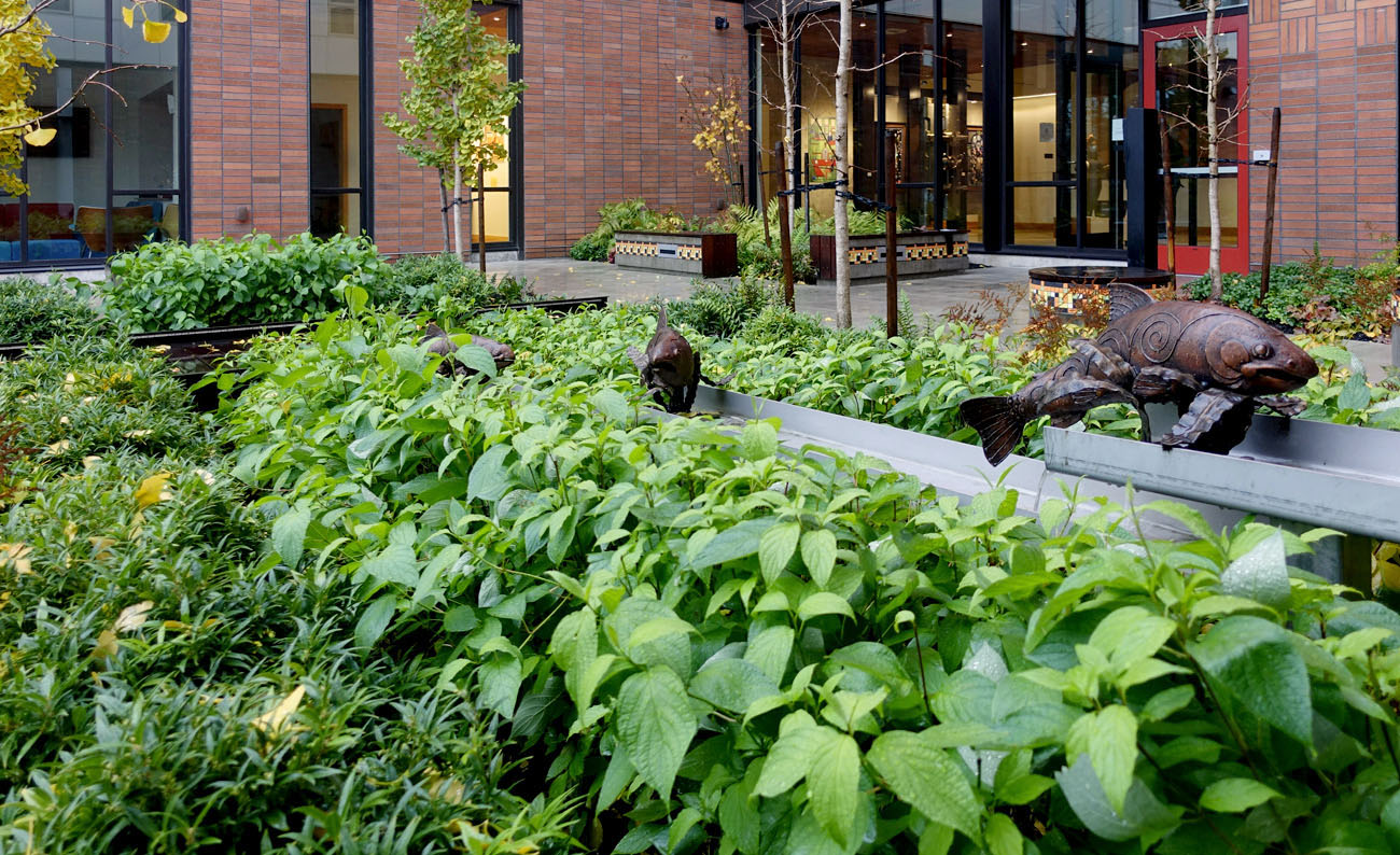 This welcoming entrance courtyard in the Central District integrates stormwater from the roof with an art installation of three bronze salmon called “Struggle Against the Current” by artist Esther Ervin. Her work is also referencing nearby artwork, “Fountains of Triumph” by James Washington, Sr.