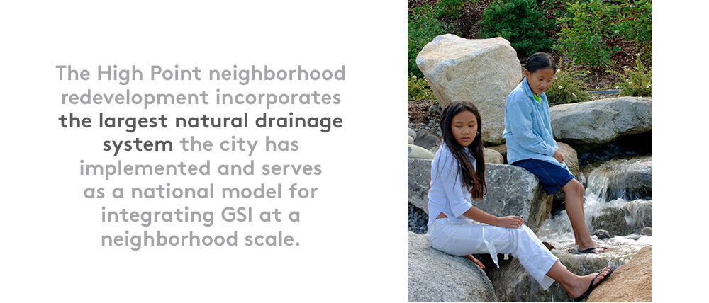 Completed in phases between 2005 and 2009, High Point demonstrates that dense urban environments can support large-scale ecological infrastructure. High Point was recognized with the Urban Land Institute’s Global Award for Excellence in 2007 which highlighted the integration of green infrastructure, sustainable design with mixed income housing and the physical and mental health benefits for residents.