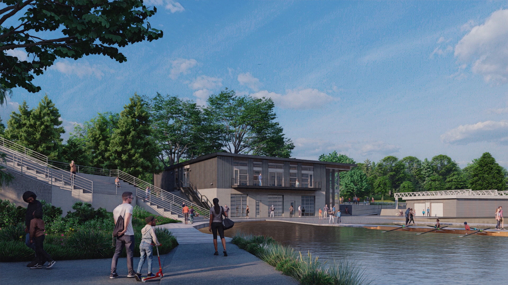 More efficient and expanded boat storage on the ground level supports the growth of both youth and adult programs. A large multipurpose space on the upper level increases the facility’s capacity for meetings, community events and trainings, workouts and off-water instruction.