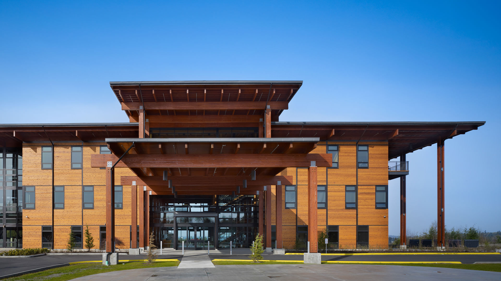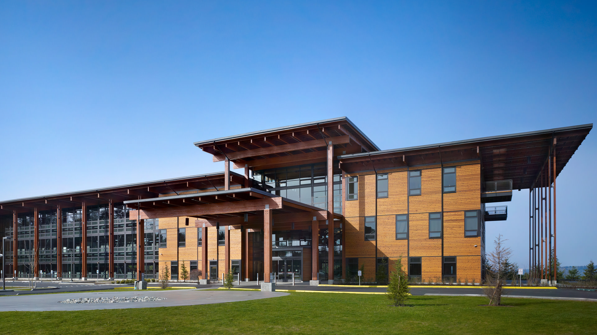 The building lays across a ridge that divides meadow from forest, with a narrow floorplate to optimize daylighting, ventilation and panoramic views of Tulalip Bay. Forested setbacks and extensive raingardens protect the Battle Creek watershed. Extensive use of cedar and Tulalip artisanal elements connect to forest and culture.