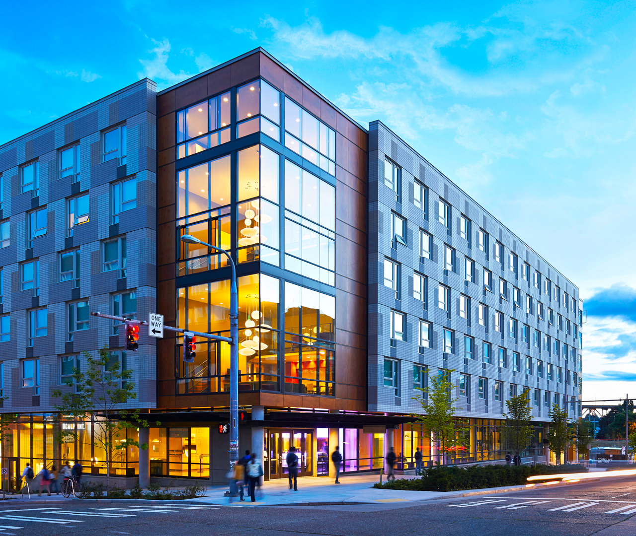 Lander Hall is one of three residence halls designed by Mithun to replace two mid-century residential towers that blocked vehicular and pedestrian flow across the neighborhood. This reintroduction of the city grid with distributed amenities creates street-level mixing between buildings and a renewed sense of place at the intersection of campus and city.